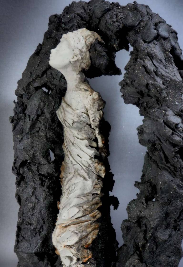 In this piece the female figure, walks with confidence out of the mocking faces of doubt, hostility and darkness, into the light. 'No' matter' she says to herself, and walks on claiming her own sovereignty ans strength.