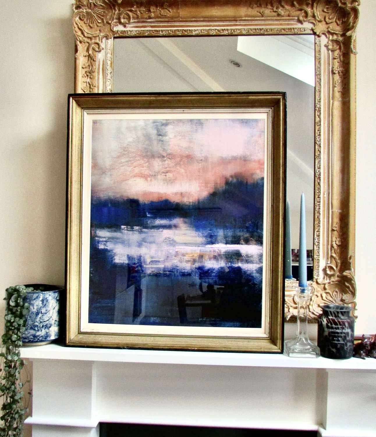 A large print on textured art paper, showing a moody night time scene on the river. The frame is a beautiful heavy weight, vintage frame which has been restored. the inner edge of the frame is gold and the outer edge is black, a rare and beautiful frame.