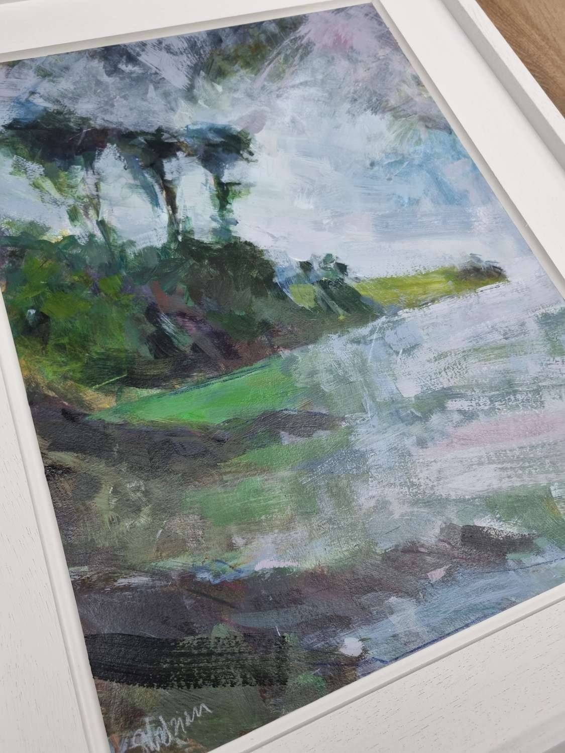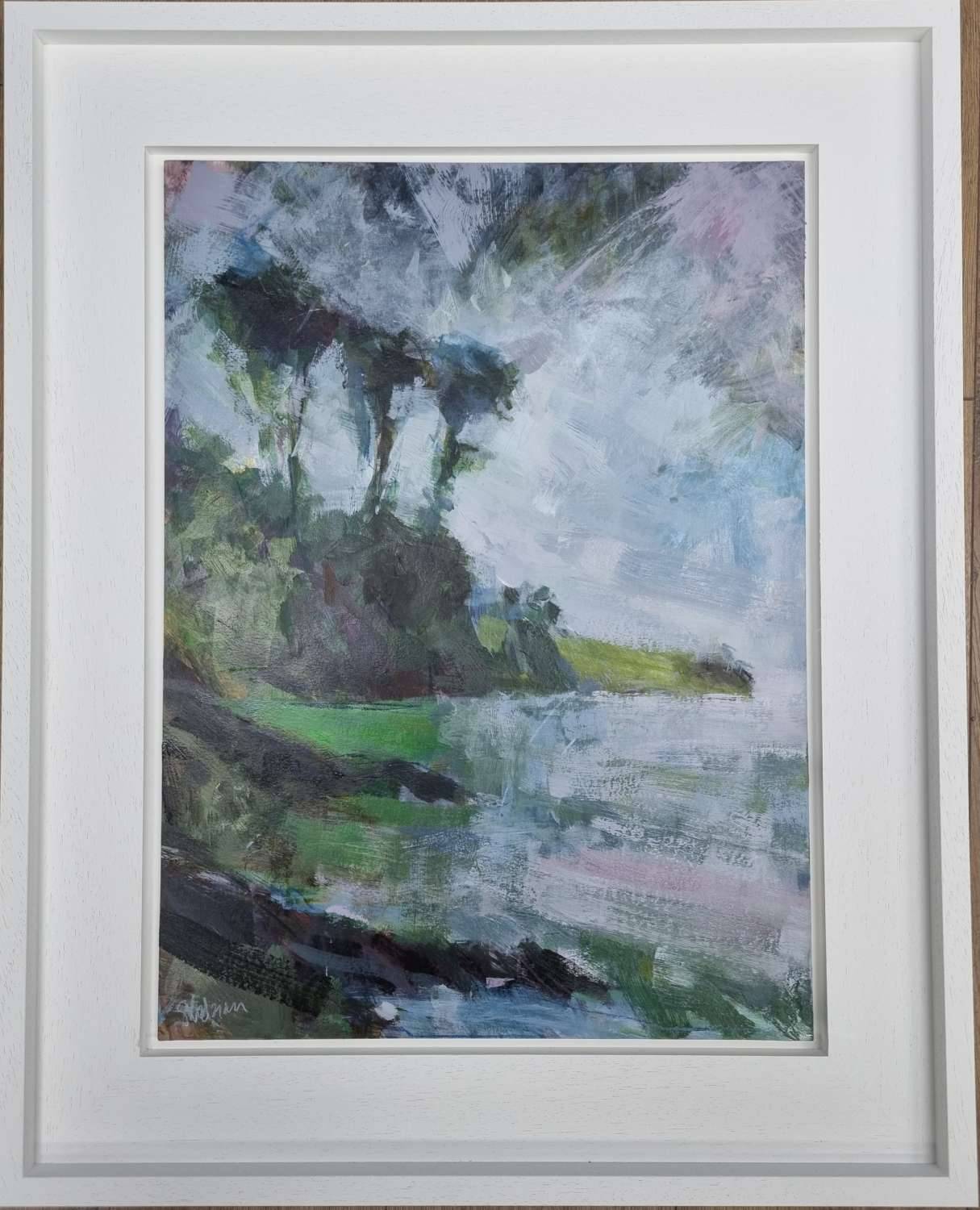 A swim at Grebe, in sunshine. Watching the heaving rain clouds inch closer, telltale vertical lines foretelling of rain at the river mouth. And then it came. Lashing down, everything soaked, paint running off the page. Beautiful, shimmering reflections, lush greens and golds. I pack up and retreat indoors.