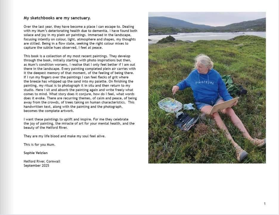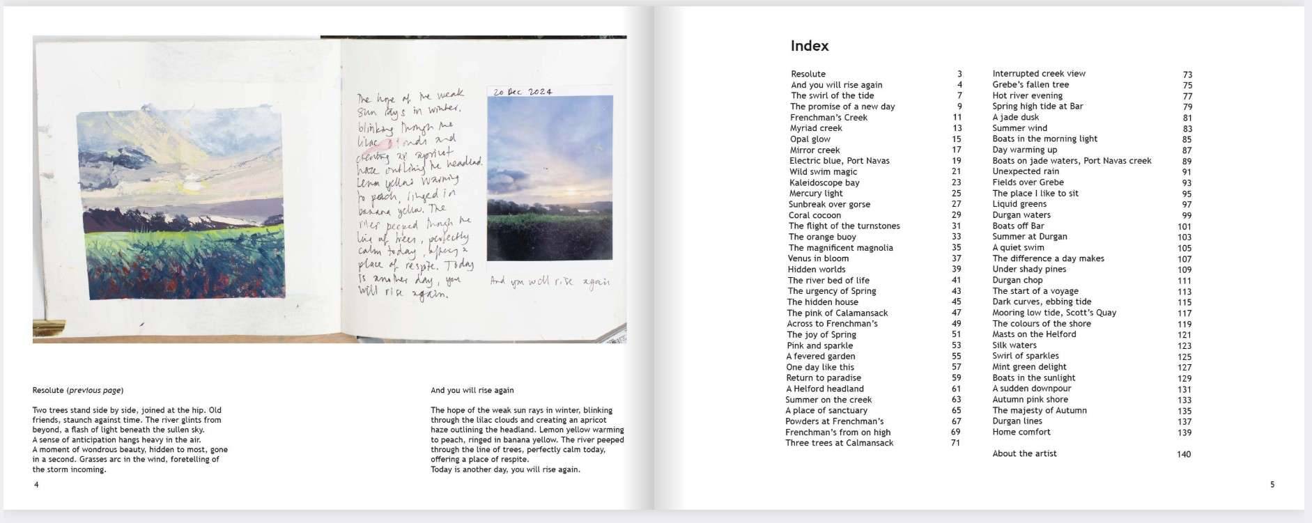 This book is a collection of my most recent paintings. They develop through the book, initially starting with photo inspirations but then, as Mum’s condition worsens, I realise that I only feel better if I am out there in the landscape. Every painting completed plein air carries with it the deepest memory of that moment, of the feeling of being there. If I run my fingers over the paintings I can feel flecks of grit where the breeze has whipped up the sand into my palette. On finishing the painting, my ritual is to photograph it in situ and then return to my studio. Here I sit and absorb the painting again and write freely what comes to mind. What story does it conjure, how do I feel, what words does it evoke. There are recurring themes, of calm and peace, of being away from the crowds, of trees taking on human characteristics. This handwritten text, along with the painting and the photograph, becomes the complete artwork.