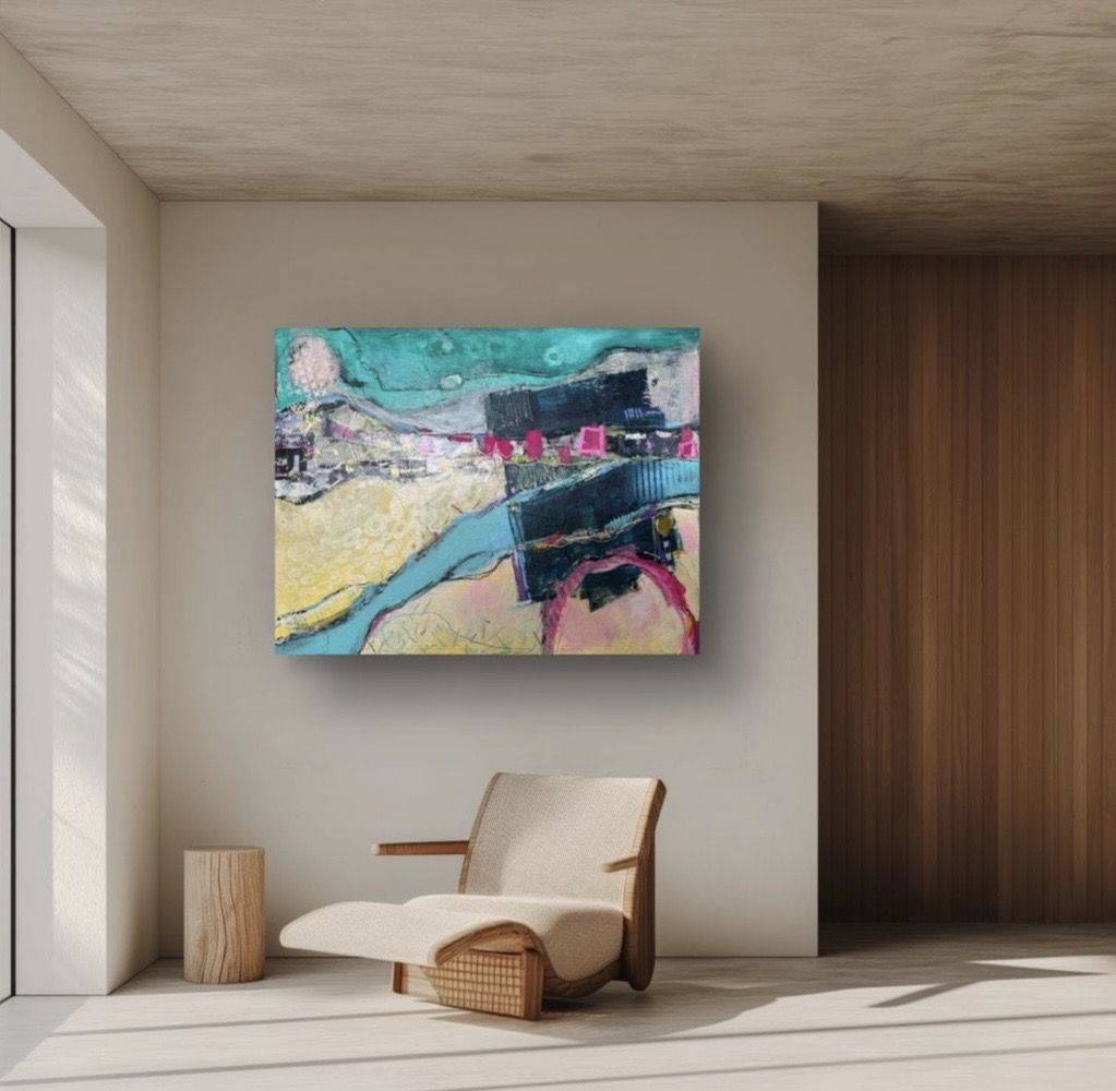 Aer #2/5 (2026), the second work in this limited edition of five paintings, again using collage, acrylic and mixed media explores the marks left as the earth grows and evolves leaving forms and fissures engulfing man made objects whilst man makes objects to work alongside the evolution - roads, railways, canals and settlements.